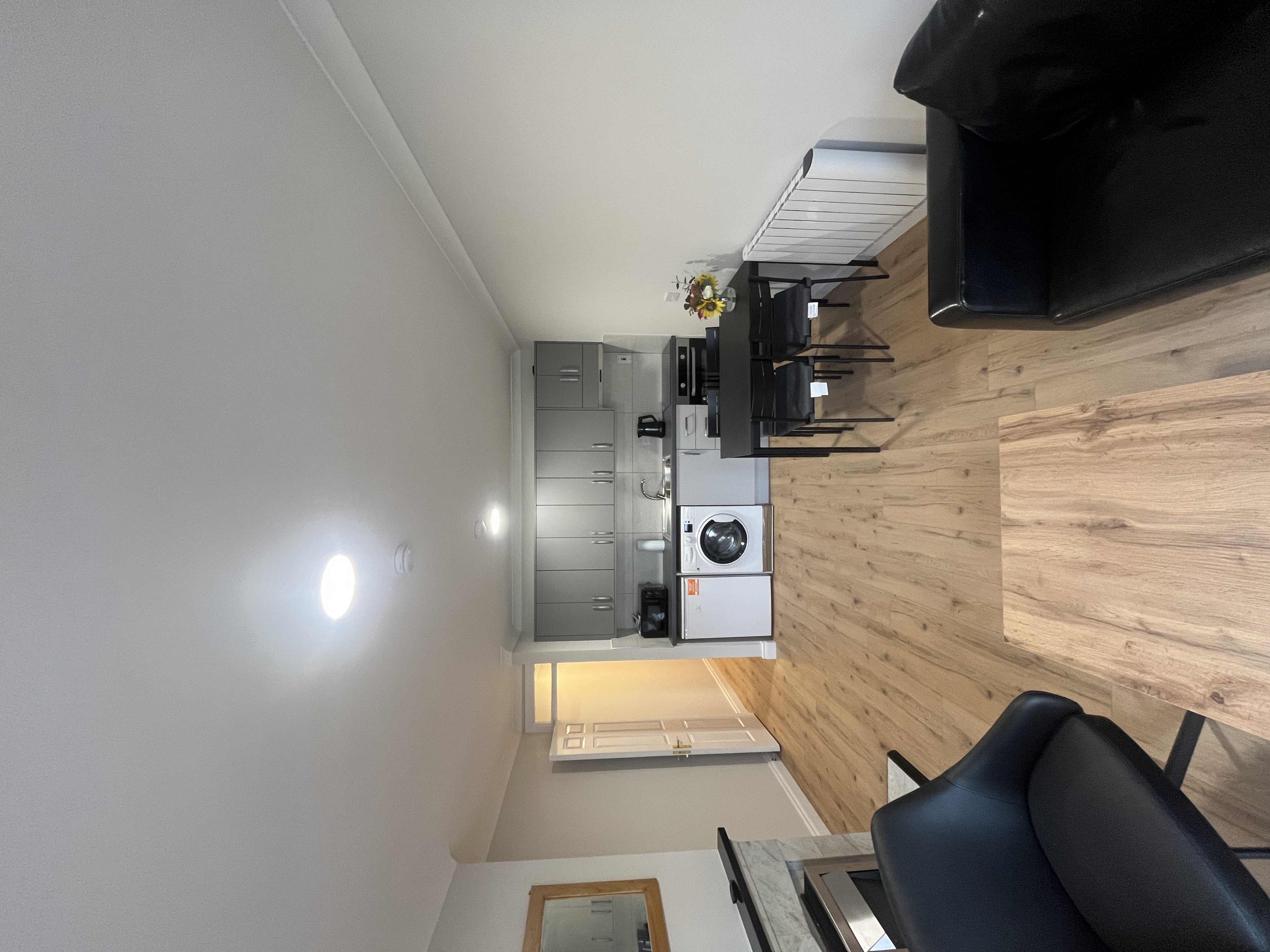 The apartment features a modern living space with an electric heater fireplace, a well-laid-out kitchen area, and a spacious double bedroom. The bathroom has been upgraded and includes an electric shower.